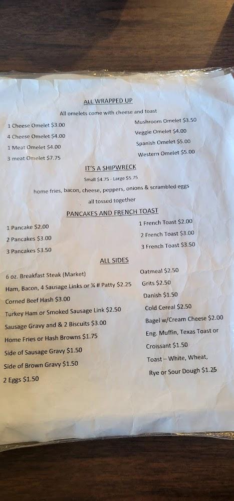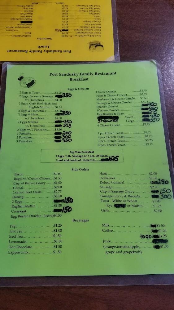The menu at Port Sandusky Family Restaurant features a variety of comforts and classic dishes. Breakfast comprises several choices, focusing on eggs, omelets, and hearty sides. Signature items include the 2 Eggs & Home Fries platter and Farmers Omelet & Toast, priced well for everyone.
